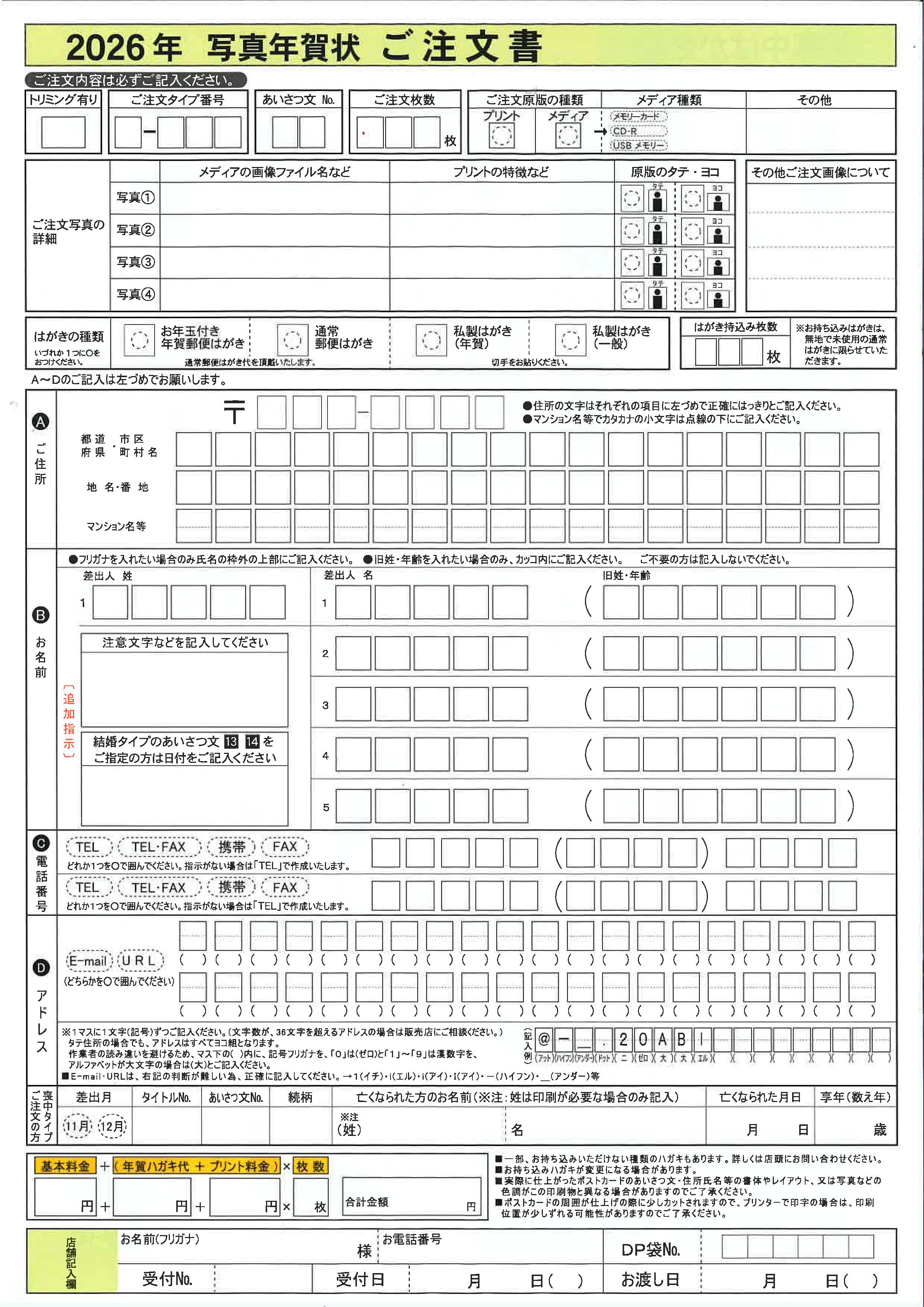 ※はがき持ち込みの場合= 基本料金 + プリント料金 × 枚数